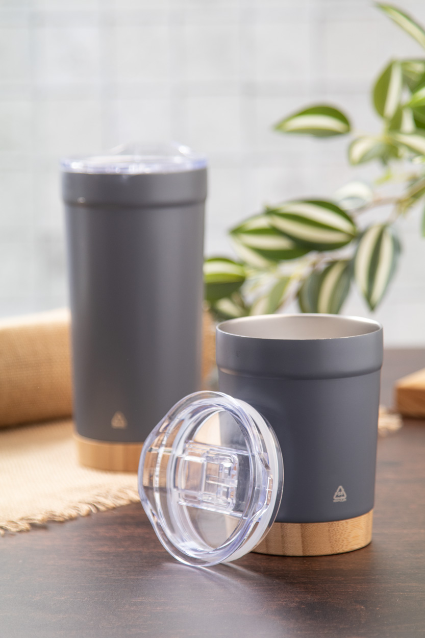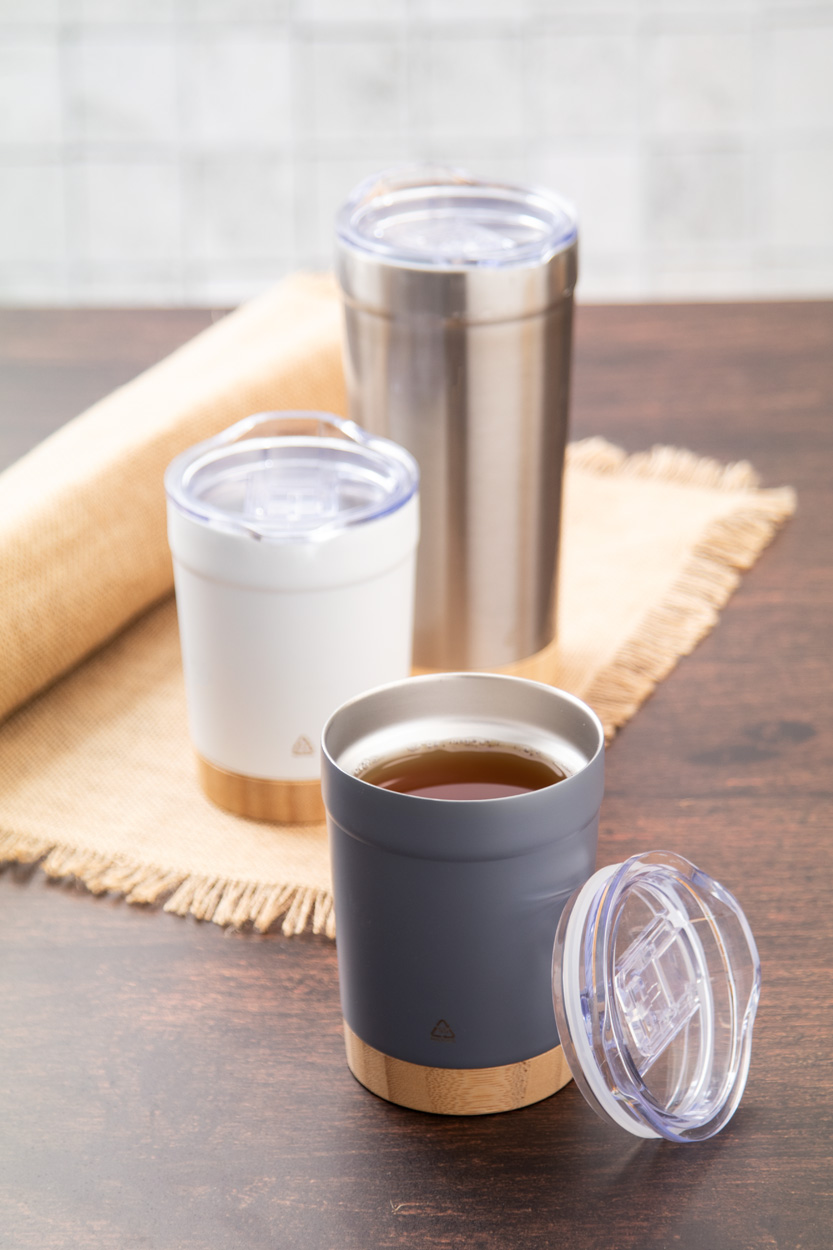 Doppelwandiger Vakuum-Thermobecher aus recycletem Edelstahl mit Bambusboden und Trinkdeckel aus AS Kunststoff. Füllmenge: 300 ml.