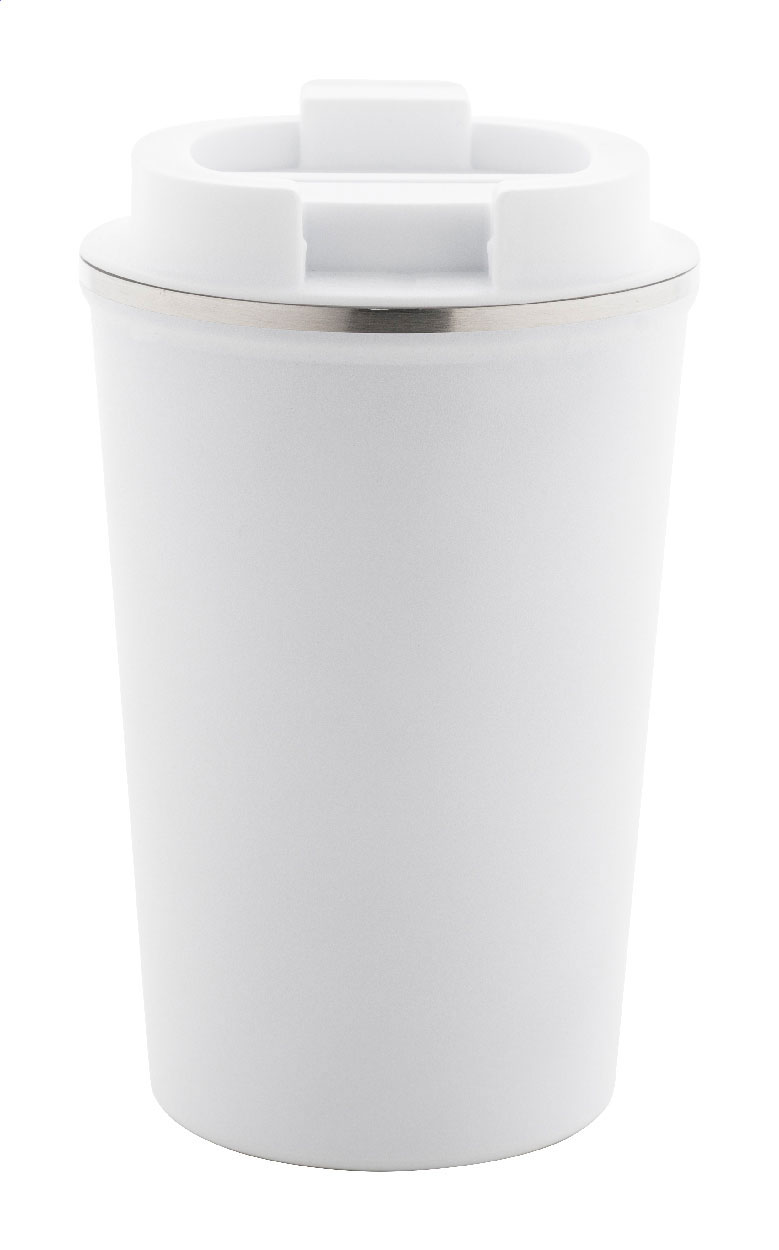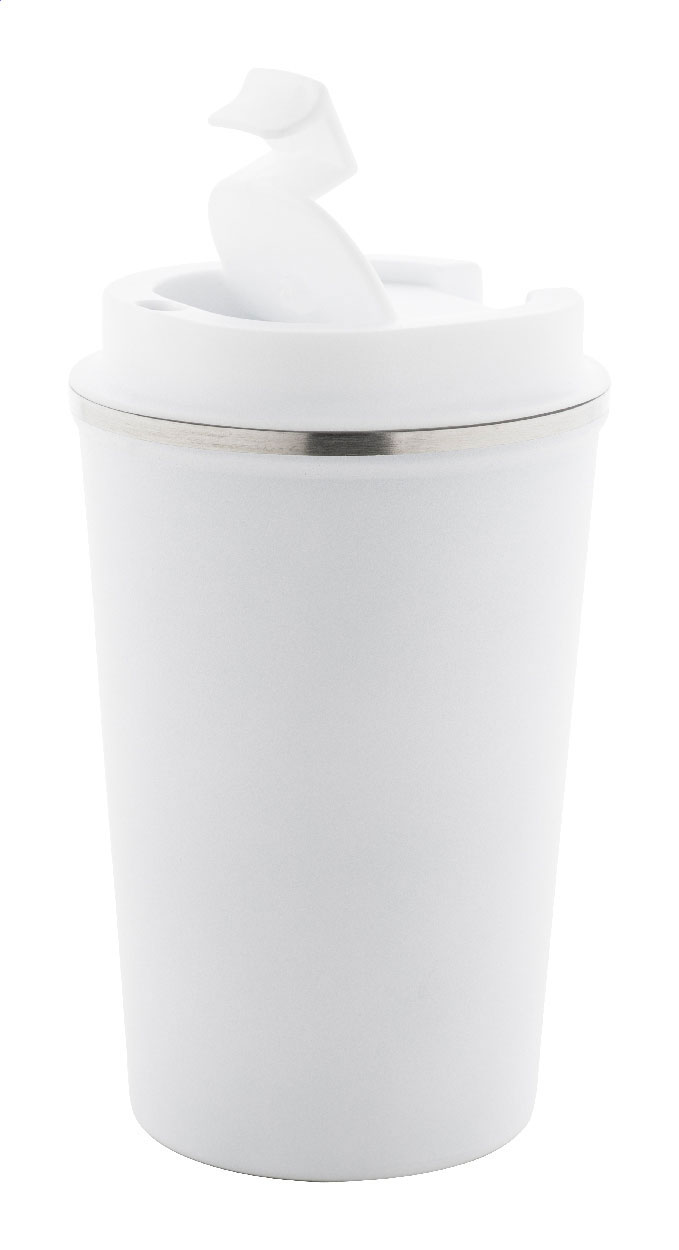Doppelwandiger Thermobecher aus Edelstahl mit Trinkdeckel. Füllmenge: 350 ml.