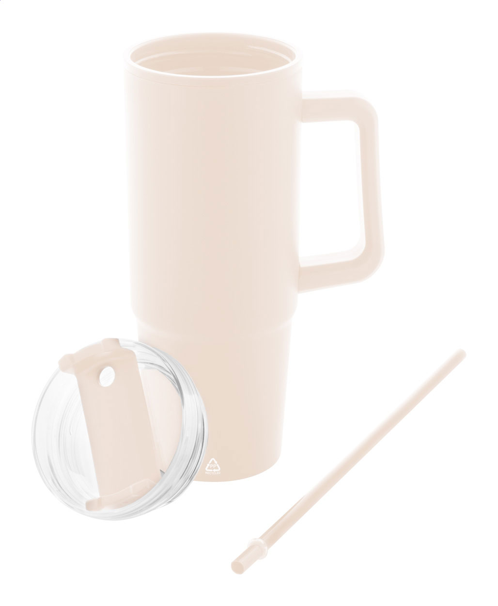 Doppelwandiger Isolier-Thermobecher aus recyceltem PP Kunststoff mit Trinkdeckel und Trinkhalm aus Kunststoff. Füllmenge: 900 ml.