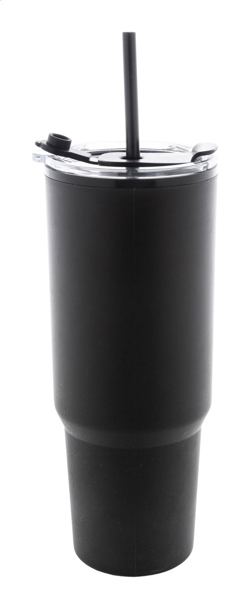 Doppelwandiger, isolierter Thermobecher aus PP-Kunststoff mit Trinkdeckel und Strohhalm. Füllmenge: 1100 ml.