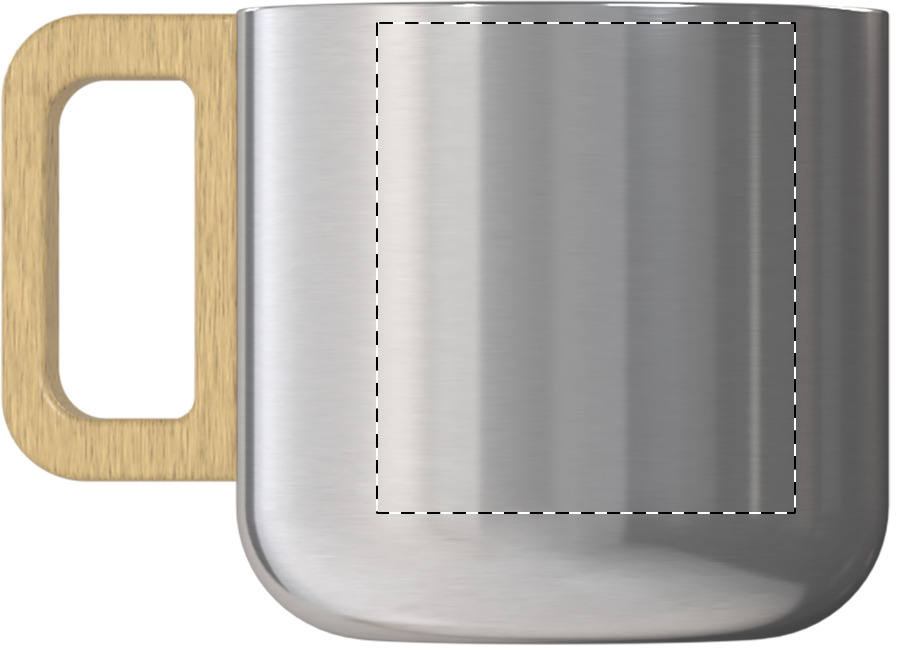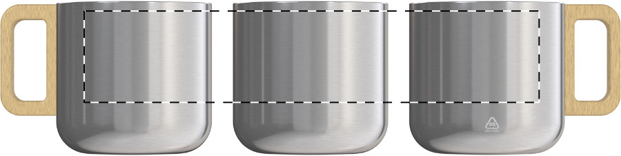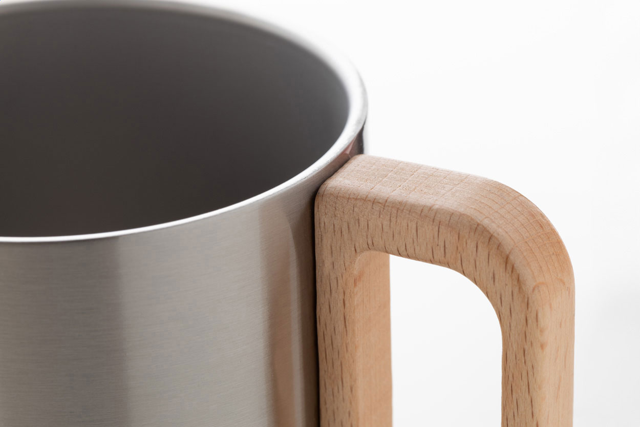 Doppelwandiger Thermobecher aus recyceltem Edelstahl mit Holzgriff. Füllmenge: 350 ml.