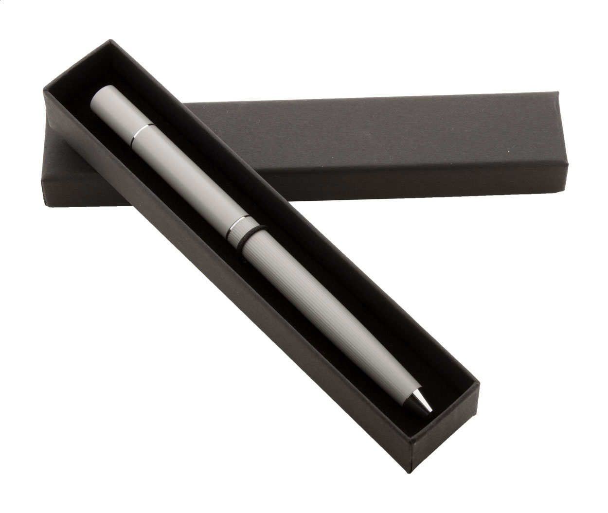 2in1 Drehkugelschreiber (blauschreibend) und tintenloser Stift aus Metall, verpackt in einer schwarzen Geschenkbox. Der tintenlose Stift hat eine Mine aus einer Metalllegierung, die das Papier zum oxidieren bringt.