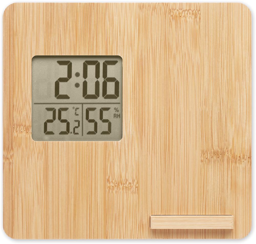 Induktive 15W Ladestation mit Zeit-, Temperatur- und Luftfeuchtigkeitsanzeige. Mit integriertem Smartphone-Halter. Gehäuse aus Bambus. Inkl. 1 CR2032. Kabelloser Ausgang: DC 9V/1.15A (15W) für schnelles Aufladen. Kompatibel mit den neuesten Android Smartphones, iPhone® 8, X und neueren Modellen.