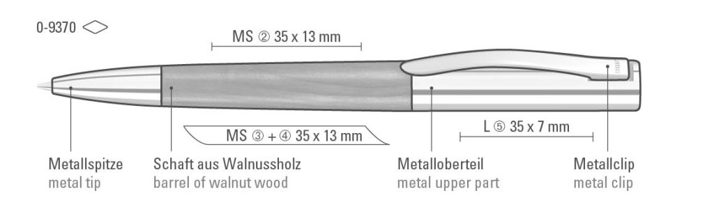 Druckbereich: In Clipverlängerung 35mm x 13mm Siebdruck (MS), gegenüber vom Clip 35mm x 13mm Siebdruck (MS), seitlich vom Clip 35mm x 13mm Siebdruck (MS), auf der Kappe/auf dem Oberteil 35mm x 7mm Lasergravur (L), auf der Kappe/auf dem Oberteil 35mm x 7mm Einzelnamensgravur (EL)