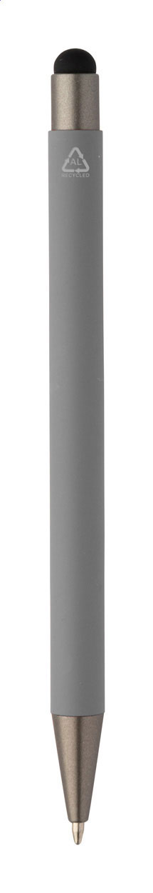 Kugelschreiber mit Touchpen aus recyceltem Aluminium mit Softtouch Oberfläche und Teilen in Gunmetal-Optik. Blauschreibend.