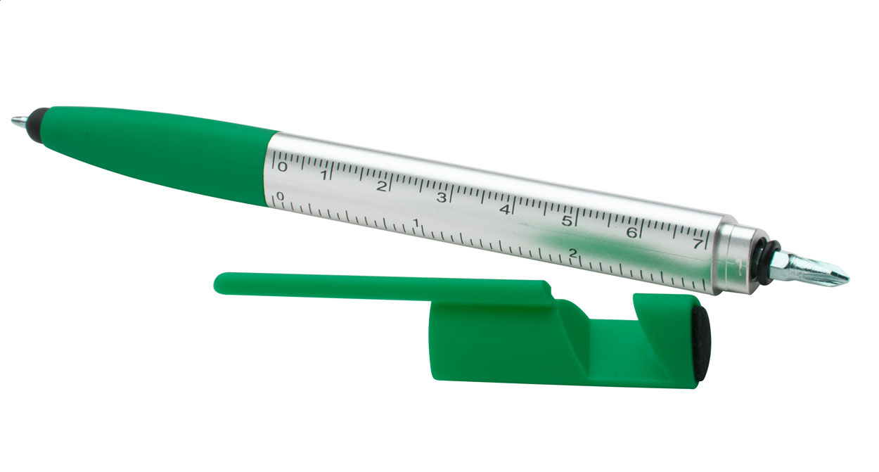 5in1 Kunststoffkugelschreiber mit Touchpen, Handyhalter, Lineal, Schraubendreher und Bildschirmreiniger, blauschreibend.Maße: ø13×157 mmSchreibgerät-Typ: KugelschreiberSchreibgerät-Mechanik: DrehmechanikSchreibfarbe: BlauMinentyp: Normale MineTouchpen: JaLinienstärke: 1 mmMaterial: KunststoffVeredelungsposition 1: Korpus - rechts vom ClipTechnologie: TampondruckMaximale Farben: 2Durchmesser: 0Druckcode: P1Veredelungsposition 2: Korpus - links vom ClipTechnologie: TampondruckMaximale Farben: 2Durchmesser: 0Druckcode: P1