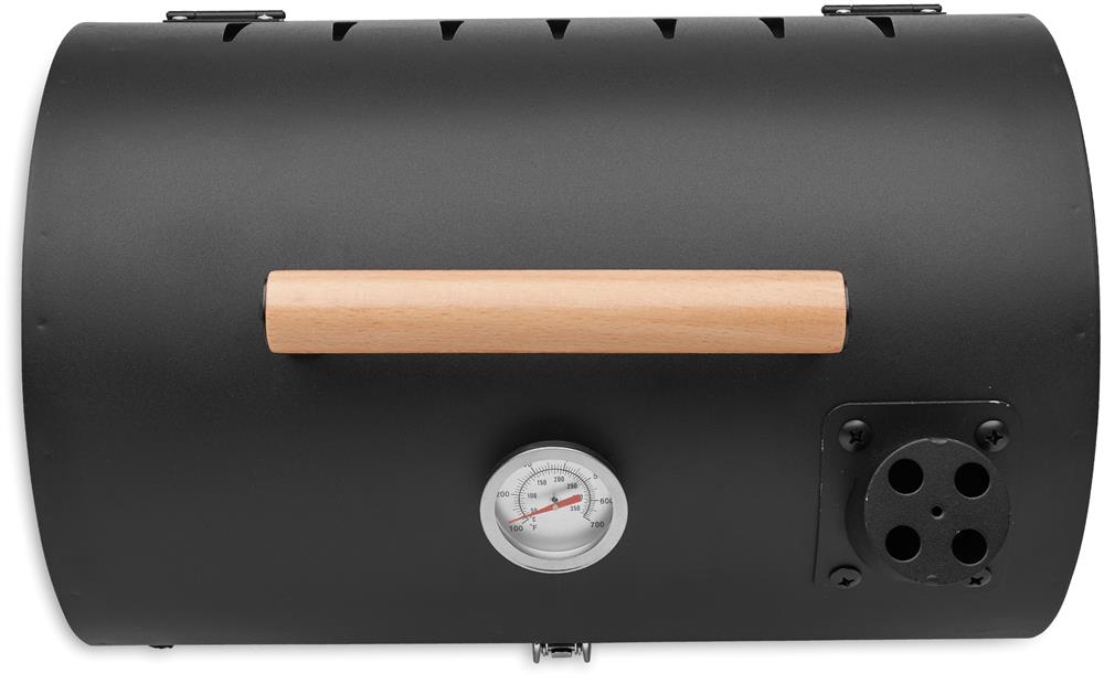 Tragbarer BBQ Grill aus Eisen mit Rauchabzug und Temperaturanzeige. Pulverbeschichteter Korpus. Tragegriff aus Holz.