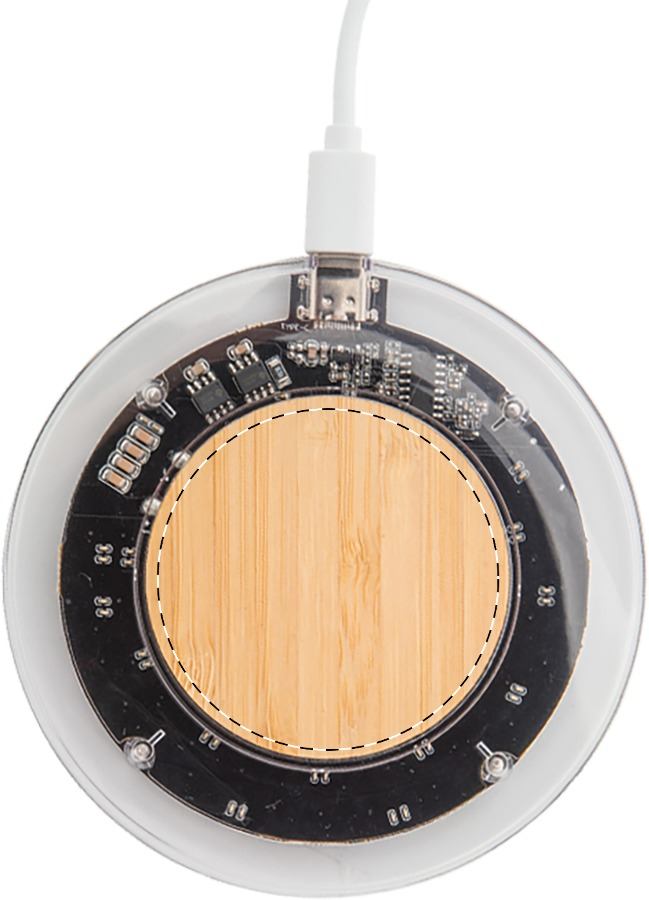Wireless-Fastcharger (15 W) aus transparenten Kunststoff- und im Bambusgehäuse mit sichtbaren elektronischen Bauteilen. Inklusive USB-Ladekabel.