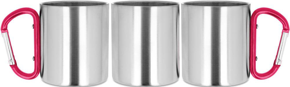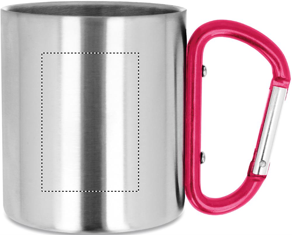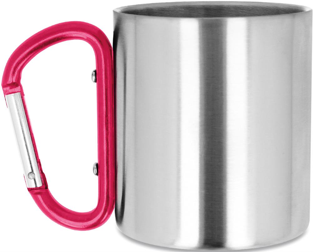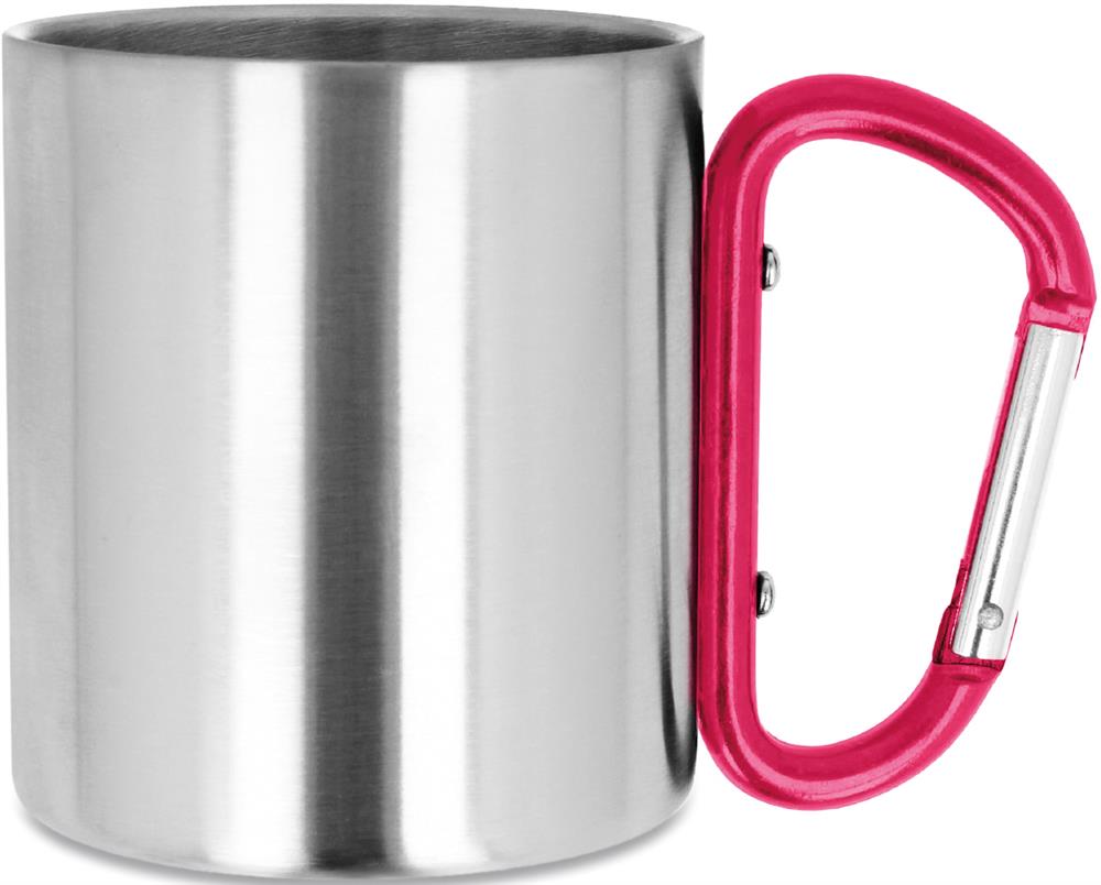 Doppelwandiger Trinkbecher aus Edelstahl. Henkel mit Karabiner. Füllmenge: 220 ml. Der Karabiner ist NICHT als Sicherung beim Klettern geeignet.