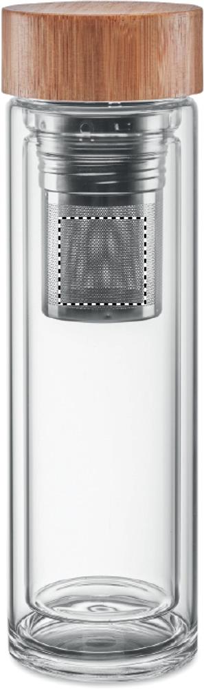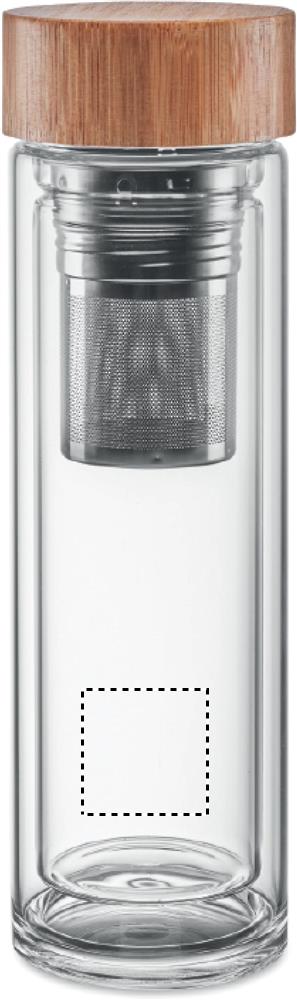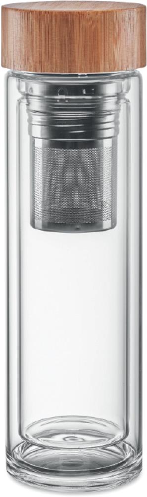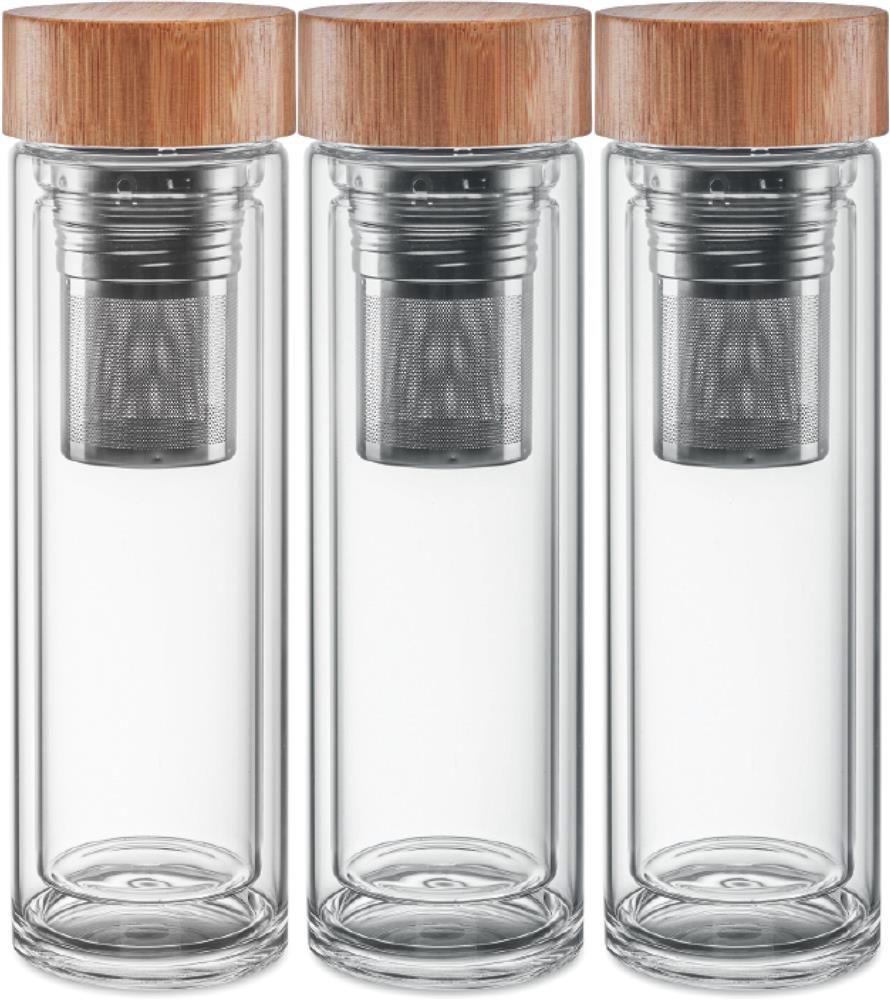 Doppelwandige Trinkflasche aus Borsilikat-Glas. Deckel aus Bambus. Mit Tee-Sieb. Füllmenge: 400 ml. Bambus ist ein natürliches Produkt, es kann daher zu leichten Abweichungen in Farbe, Dekor und Maßen kommen. Auslaufsicher. Eine Lasergravur ist auf Borosilikatglas nicht möglich.