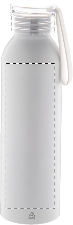 Trinkflasche aus recyceltem Aluminium mit farblich passendem Deckel und Silikontrageriemen. Füllmenge: 600 ml.