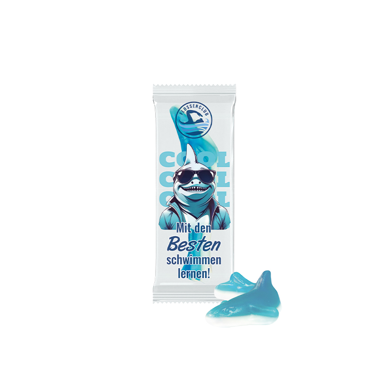Flowpack aus weißer, kompostierbarer Folie, individuell bedruckt. Inhalt: 1 Trolli Fruchtgummi "Haifisch" blau, mit weißem Schaumzuckerbauch, 8g, Sonderfarben und -geschmacksrichtungen ab 50.000 Stück auf Anfrage