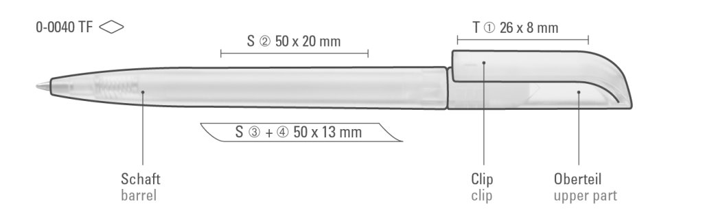 Druckbereich: Auf dem Clip 26mm x 8mm Tampondruck (T), in Clipverlängerung 50mm x 20mm Siebdruck (S), gegenüber vom Clip 50mm x 13mm Siebdruck (S), seitlich vom Clip 50mm x 13mm Siebdruck (S)