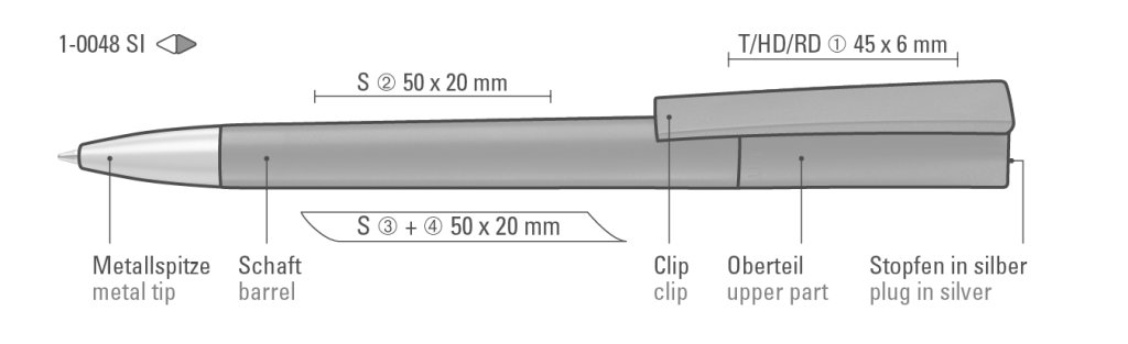 Druckbereich: In Clipverlängerung 50mm x 20mm Siebdruck (S), seitlich vom Clip 50mm x 20mm Siebdruck (S), gegenüber vom Clip 50mm x 20mm Siebdruck (S), auf dem Clip 45mm x 6mm Tampondruck (T), auf dem Clip 45mm x 6mm Digitaldruck (HD), auf dem Clip 45mm x 6mm Reliefdruck (HD)