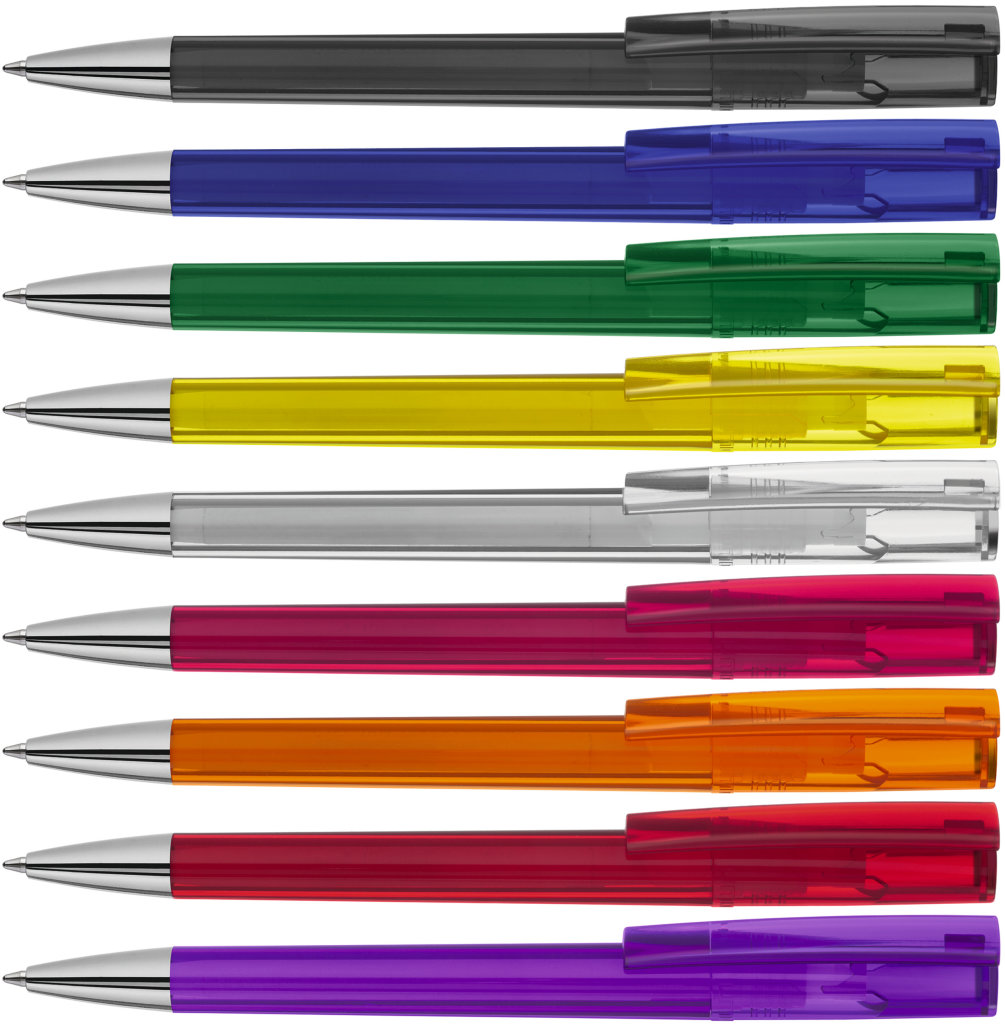Farbiger Kugelschreiber aus Kunststoff, schwarzschreibend.Maße: ø10×138 mmSchreibgerät-Typ: KugelschreiberSchreibgerät-Mechanik: DruckmechanikSchreibfarbe: SchwarzMinentyp: Normale MineLinienstärke: 1 mmMaterial: KunststoffVeredelungsposition 1: Korpus - rechts vom ClipTechnologie: TampondruckMaximale Farben: 4Durchmesser: 0Druckcode: P0Technologie: TampondruckMaximale Farben: 1Durchmesser: 0Druckcode: P1Technologie: UV LED DruckDurchmesser: 0Druckcode: UVAVeredelungsposition 2: Korpus - links vom ClipTechnologie: TampondruckMaximale Farben: 4Durchmesser: 0Druckcode: P0Technologie: TampondruckMaximale Farben: 1Durchmesser: 0Druckcode: P1Technologie: UV LED DruckDurchmesser: 0Druckcode: UVAVeredelungsposition 3: KlipTechnologie: TampondruckMaximale Farben: 4Durchmesser: 0Druckcode: P0Veredelungsposition 4: Korpus - in Verlängerung vom ClipTechnologie: TampondruckMaximale Farben: 4Durchmesser: 0Druckcode: P0