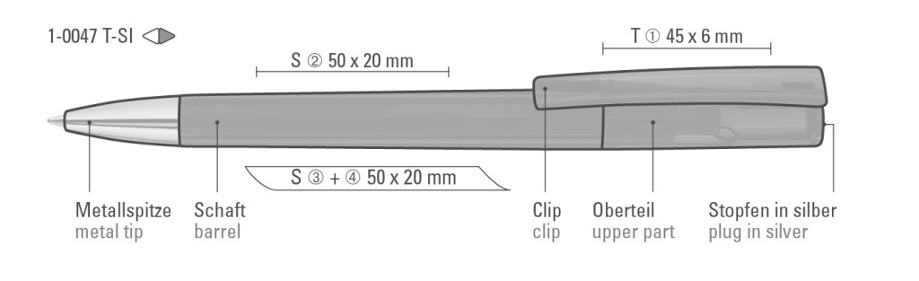 Druckbereich: Auf dem Clip 45mm x 6mm Tampondruck (T), in Clipverlängerung 50mm x 20mm Siebdruck (S), gegenüber vom Clip 50mm x 20mm Siebdruck (S), seitlich vom Clip 50mm x 20mm Siebdruck (S)