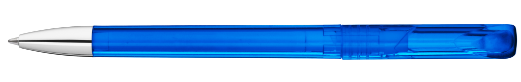 Drehkugelschreiber mit transparent glänzendem Gehäuse, gefrosteter Clipoberfläche und Spitze glanzverchromt.