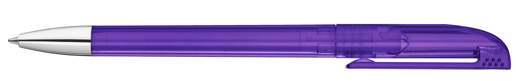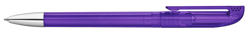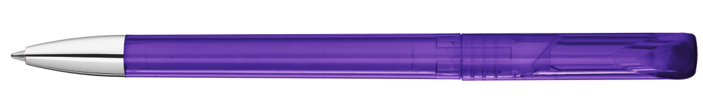 Drehkugelschreiber mit transparent glänzendem Gehäuse, gefrosteter Clipoberfläche und Spitze glanzverchromt.
