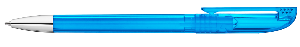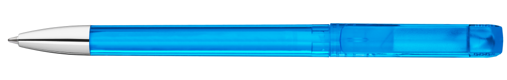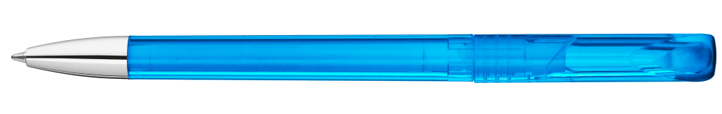Drehkugelschreiber mit transparent glänzendem Gehäuse, gefrosteter Clipoberfläche und Spitze glanzverchromt.
