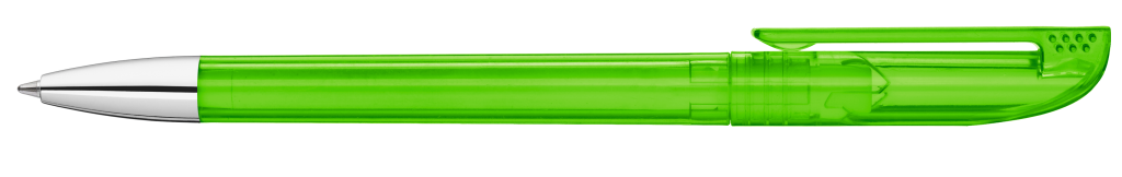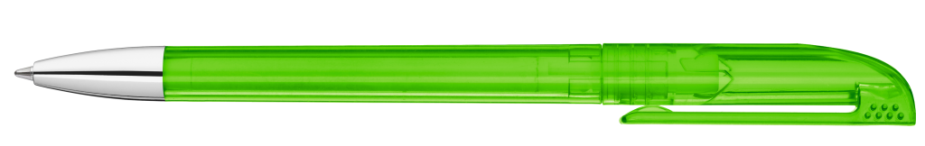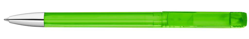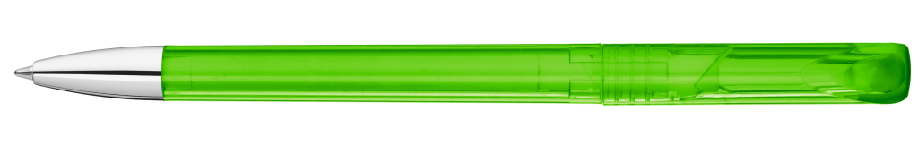 Drehkugelschreiber mit transparent glänzendem Gehäuse, gefrosteter Clipoberfläche und Spitze glanzverchromt.