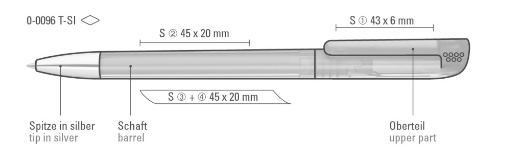 Drehkugelschreiber mit transparent glänzendem Gehäuse, gefrosteter Clipoberfläche und Spitze glanzverchromt.Druckbereich: Auf dem Clip 43mm x 6mm Siebdruck (S), in Clipverlängerung 45mm x 20mm Siebdruck (S), gegenüber vom Clip 45mm x 20mm Siebdruck (S), seitlich vom Clip 45mm x 20mm Siebdruck (S)