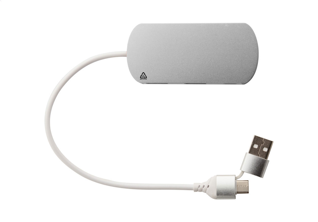 USB-Hub aus recyceltem Aluminium und recyceltem ABS mit 2 USB- und 1 USB-C-Anschluss, USB 2.0. Inklusive Kabel mit USB- und USB-C-Anschlüssen.