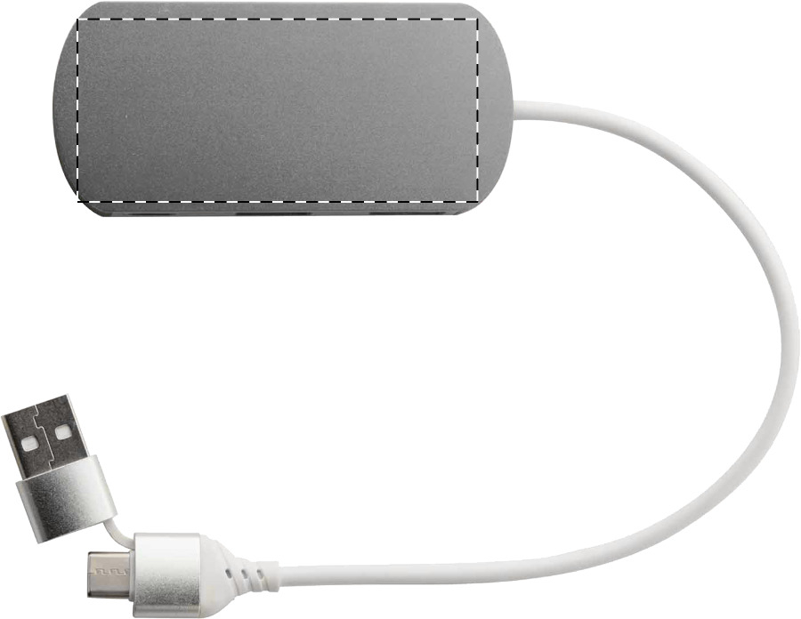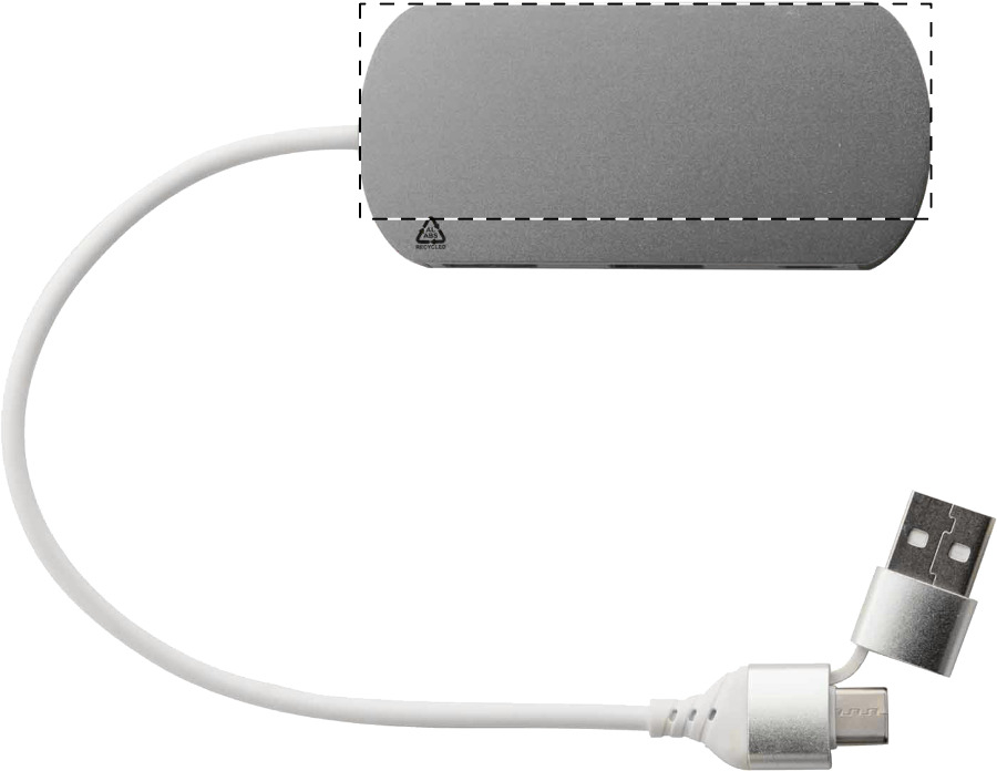 USB-Hub aus recyceltem Aluminium und recyceltem ABS mit 2 USB- und 1 USB-C-Anschluss, USB 2.0. Inklusive Kabel mit USB- und USB-C-Anschlüssen.Maße: 80×10×36 mmUSB Hub: JaAnzahl von USB Ports: 3Inklusive USB Ladekabel: JaLadbar über USB: JaLadeports - Ausgang: 2×USBMaterial: Recycletes Aluminium, Recycelter ABS-KunststoffVeredelungsposition 1: ObenTechnologie: GravurDurchmesser: 0Druckcode: E3Technologie: Gravur - EinzelnamenDurchmesser: 0Druckcode: NE3Technologie: TampondruckMaximale Farben: 2Durchmesser: 0Druckcode: P3Veredelungsposition 2: Oberseite - oberer BereichTechnologie: DomingDurchmesser: 0Druckcode: DO4