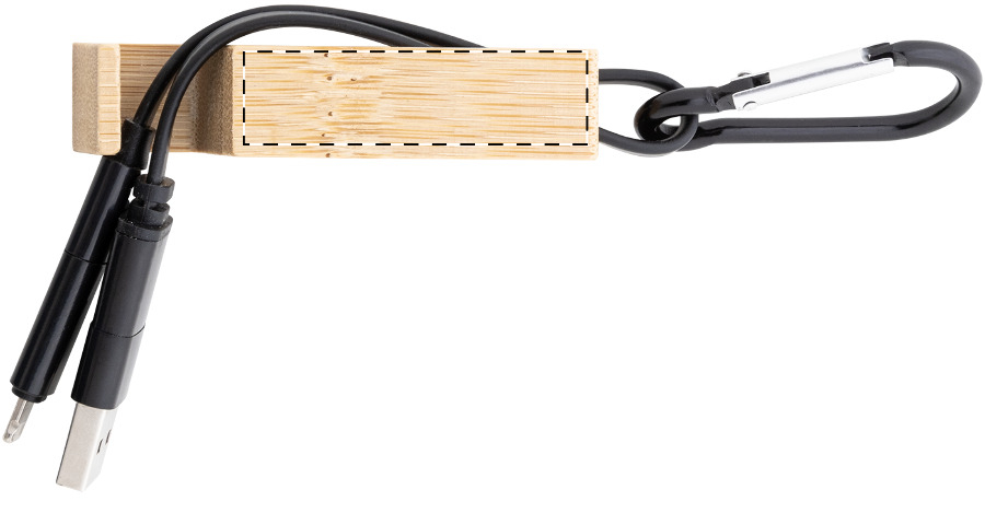 USB-Ladekabel mit Karabiner aus recyceltem Aluminium und Handyhalter aus Bambus. Mit Micro-USB-, USB-C- und Lightning-Anschlüssen. Mit USB- und USB-C-Eingängen.