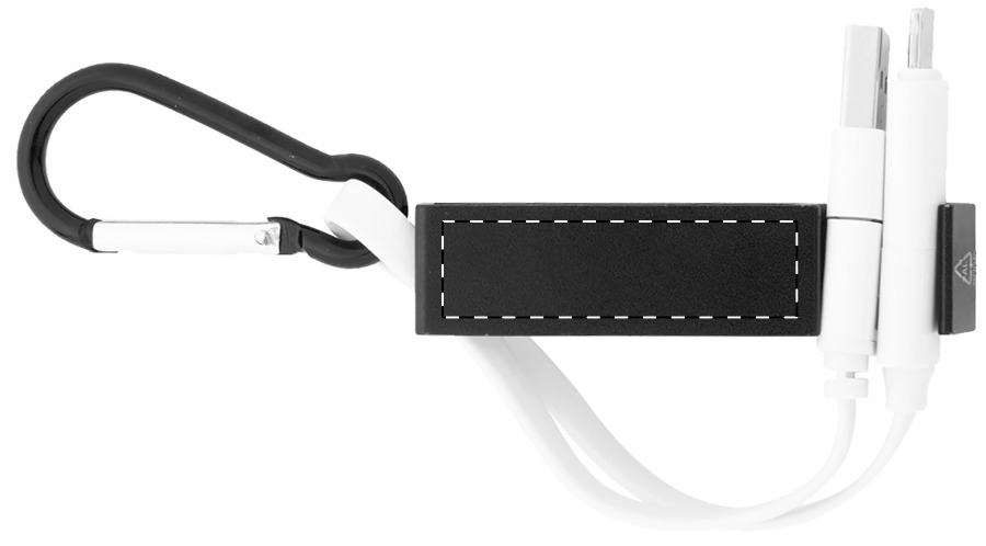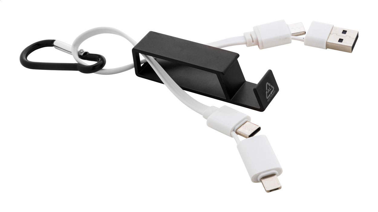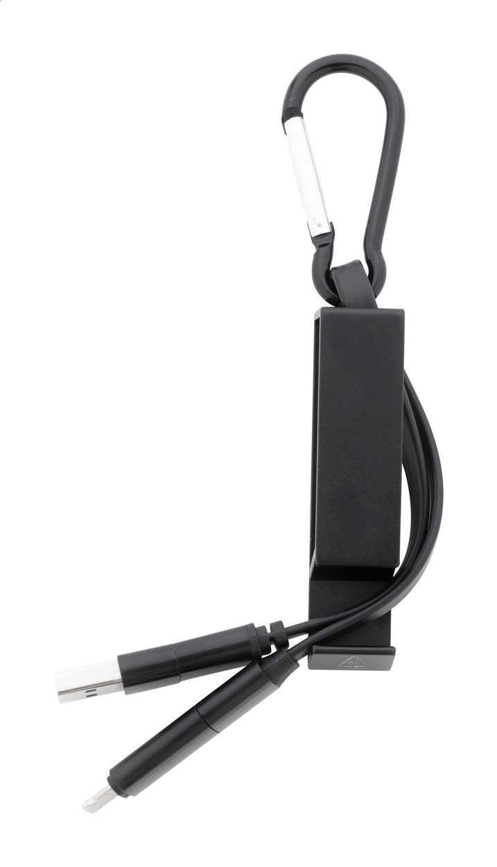 USB-Ladekabel mit Karabiner aus recyceltem Aluminium und Handyhalter mit Flaschenöffnerfunktion. Mit Micro-USB-, USB-C- und Lightning-Anschlüssen. Mit USB- und USB-C-Eingängen.