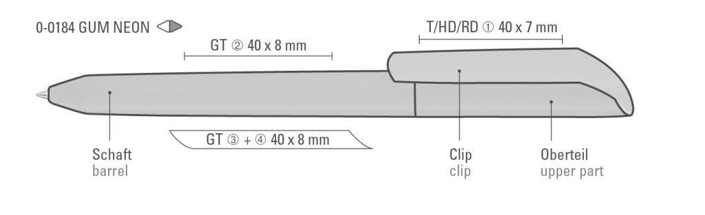 Druckbereich: Auf dem Clip 40mm x 7mm Tampondruck (T), auf dem Clip 40mm x 7mm Digitaldruck (HD), in Clipverlängerung 50mm x 20mm Siebdruck (GS), gegenüber vom Clip 50mm x 20mm Siebdruck (GS), seitlich vom Clip 50mm x 20mm Siebdruck (GS), auf dem Clip 40mm x 7mm Reliefdruck (HD)
