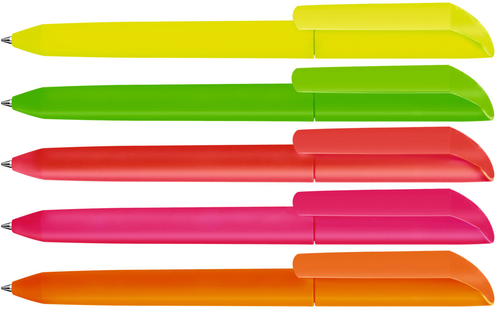 Drehkugelschreiber mit Softtouch-Gehäuse und gedeckt glänzendem Clip in Neonfarben.Druckbereich: Auf dem Clip 40mm x 7mm Tampondruck (T), auf dem Clip 40mm x 7mm Digitaldruck (HD), in Clipverlängerung 50mm x 20mm Siebdruck (GS), gegenüber vom Clip 50mm x 20mm Siebdruck (GS), seitlich vom Clip 50mm x 20mm Siebdruck (GS), auf dem Clip 40mm x 7mm Reliefdruck (HD)
