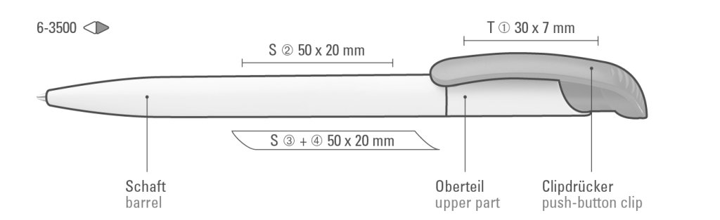 Druckbereich: Auf dem Clip 30mm x 7mm Tampondruck (T), in Clipverlängerung 50mm x 20mm Siebdruck (S), gegenüber vom Clip 50mm x 20mm Siebdruck (S), seitlich vom Clip 50mm x 20mm Siebdruck (S)