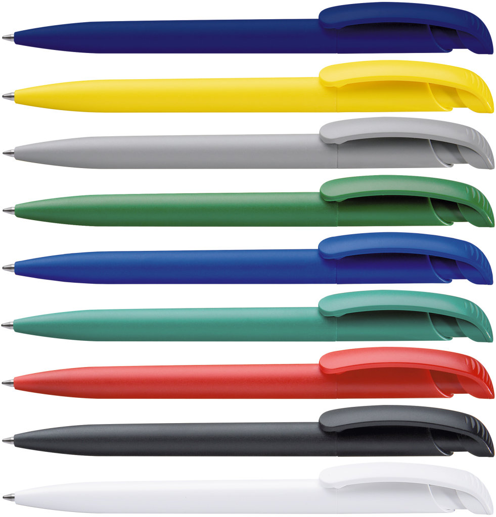 Druckkugelschreiber mit gedeckt mattem Gehäuse und Bogenclipdrücker.