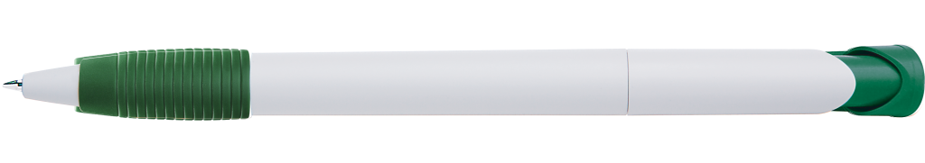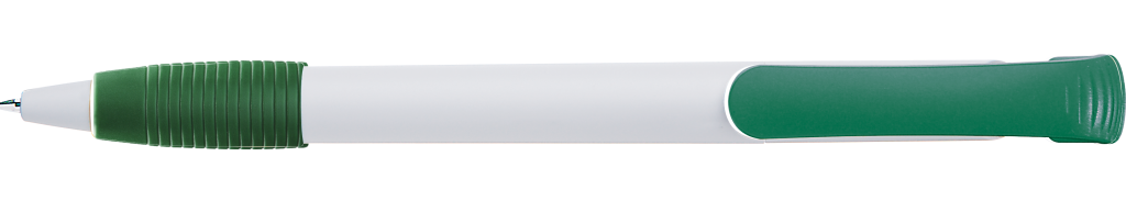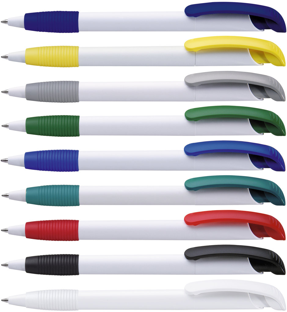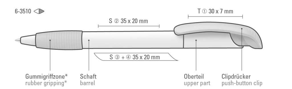 Druckkugelschreiber mit gedeckt mattem Gehäuse, Bogenclipdrücker und Gummigriffzone.Druckbereich: Auf dem Clip 30mm x 7mm Tampondruck (T), in Clipverlängerung 35mm x 20mm Siebdruck (S), gegenüber vom Clip 35mm x 20mm Siebdruck (S), seitlich vom Clip 35mm x 20mm Siebdruck (S)
