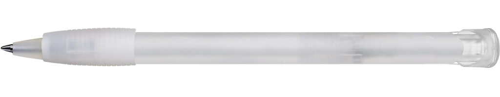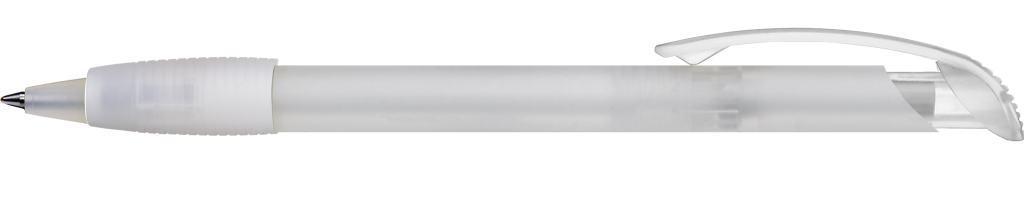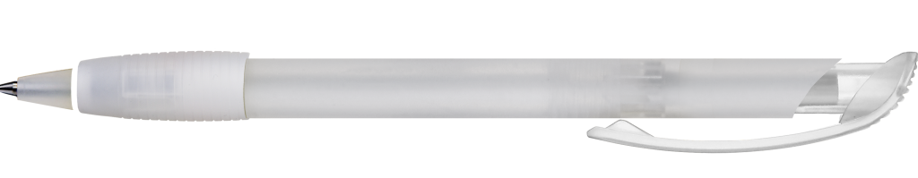 Druckkugelschreiber mit transparent gefrostetem Gehäuse, Bogenclip und Gummigriffzone.Druckbereich: Auf dem Clip 30mm x 7mm Tampondruck (T), in Clipverlängerung 35mm x 20mm Siebdruck (S), gegenüber vom Clip 35mm x 20mm Siebdruck (S), seitlich vom Clip 35mm x 20mm Siebdruck (S)