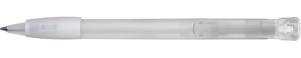 Druckkugelschreiber mit transparent gefrostetem Gehäuse, Bogenclip und Gummigriffzone.