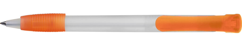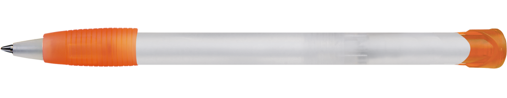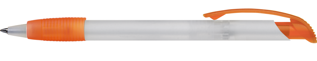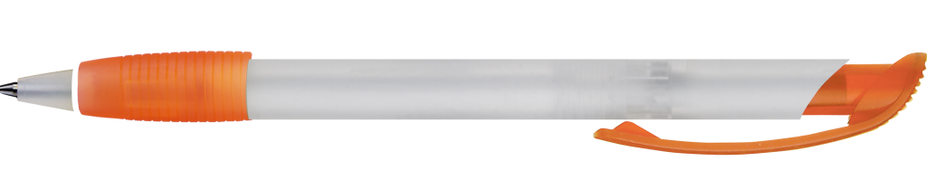 Druckkugelschreiber mit transparent gefrostetem Gehäuse, Bogenclip und Gummigriffzone.