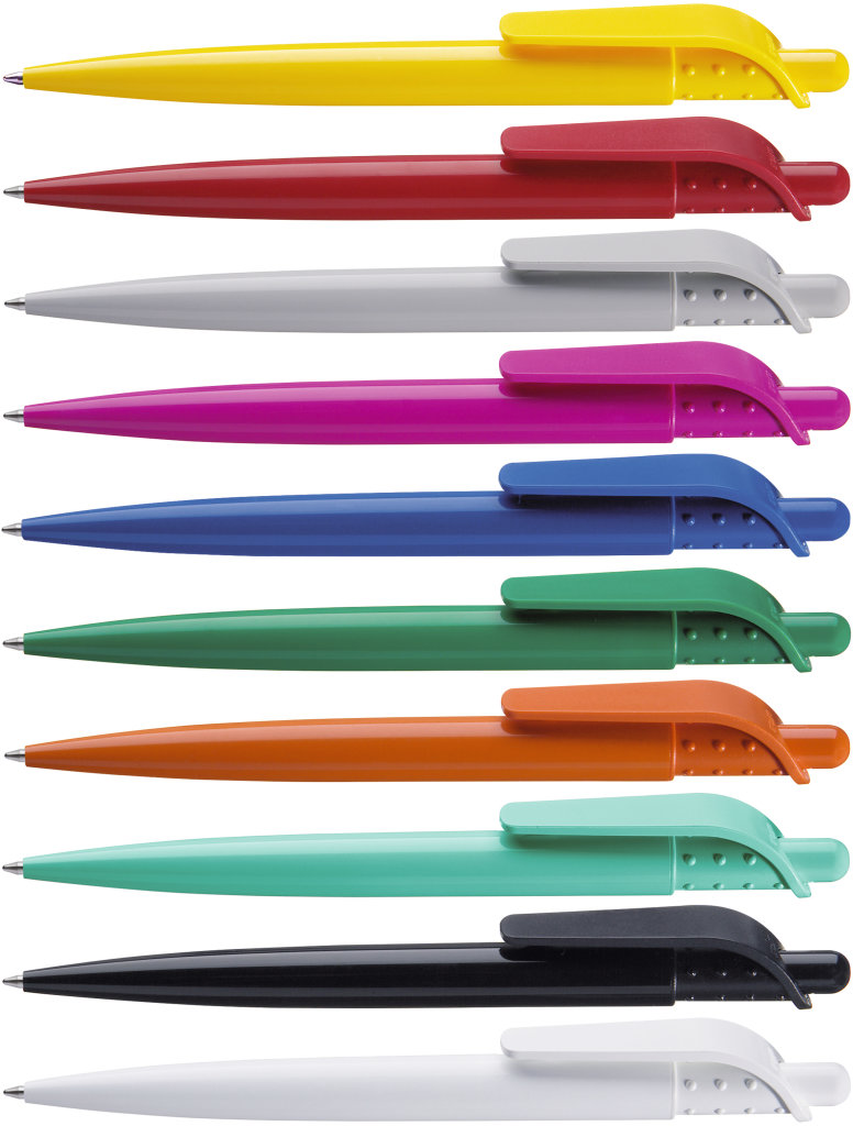 Farbiger Kugelschreiber aus Kunststoff, schwarzschreibend.Maße: ø10×138 mmSchreibgerät-Typ: KugelschreiberSchreibgerät-Mechanik: DruckmechanikSchreibfarbe: SchwarzMinentyp: Normale MineLinienstärke: 1 mmMaterial: KunststoffVeredelungsposition 1: Korpus - rechts vom ClipTechnologie: TampondruckMaximale Farben: 4Durchmesser: 0Druckcode: P0Technologie: TampondruckMaximale Farben: 1Durchmesser: 0Druckcode: P1Technologie: UV LED DruckDurchmesser: 0Druckcode: UVAVeredelungsposition 2: Korpus - links vom ClipTechnologie: TampondruckMaximale Farben: 4Durchmesser: 0Druckcode: P0Technologie: TampondruckMaximale Farben: 1Durchmesser: 0Druckcode: P1Technologie: UV LED DruckDurchmesser: 0Druckcode: UVAVeredelungsposition 3: KlipTechnologie: TampondruckMaximale Farben: 4Durchmesser: 0Druckcode: P0Veredelungsposition 4: Korpus - in Verlängerung vom ClipTechnologie: TampondruckMaximale Farben: 4Durchmesser: 0Druckcode: P0