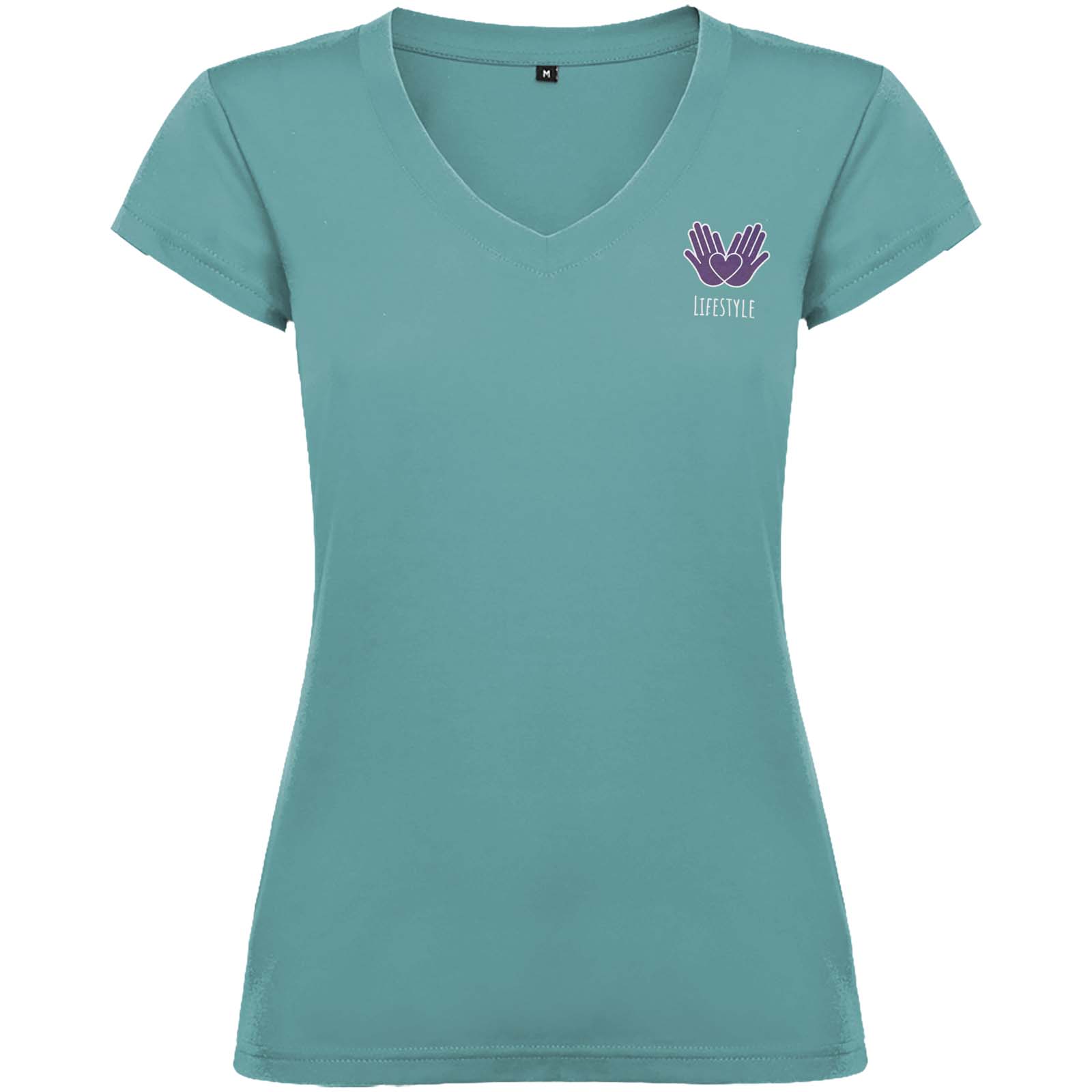 Kurzärmeliges T-Shirt für Damen mit V-Ausschnitt und 1×1-Rippstrickbündchen. Schmale Passform mit Seitennaht. Herausnehmbares Etikett. Das Modell ist 174 cm groß und trägt Größe S.Besonderheiten:- Geschlecht: Männlich- OEKO-TEX®- SMETAMaterial: Single jersey Strick 100% Baumwolle, 155 g/m2Grammatur: 155 g/m2Standard-Druck---------------Druckart: SiebdruckDruckposition: linke BrustDruckgröße: 80 x 80 mm mm (BxH)Druckfarben maximal: 5Zusätzliche Informationen: Schauen Sie bitte vor der Bestellung in die Roly Größentabelle. Roly folgt den spanischen Größen, die eine eher slim-fit Passform haben.Suchwörter: roly, t-shirt, tshirt, t shirt, t-shirts, tshirts, t shirts