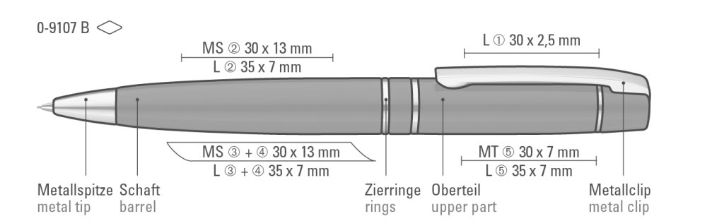 Druckbereich: In Clipverlängerung 35mm x 7mm Lasergravur (L), in Clipverlängerung 30mm x 7mm Tampondruck (MT), gegenüber vom Clip 35mm x 7mm Lasergravur (L), gegenüber vom Clip 30mm x 7mm Tampondruck (MT), seitlich vom Clip 35mm x 7mm Lasergravur (L), seitlich vom Clip 30mm x 7mm Tampondruck (MT), auf der Kappe/auf dem Oberteil 35mm x 7mm Lasergravur (L), auf der Kappe/auf dem Oberteil 30mm x 7mm Tampondruck (MT), Druckfläche 37mm x 41mm Rundumlasergravur (RL), Druckfläche 35mm x 41mm Rundumlasergravur (RL), auf dem Clip 30mm x 2,5mm Lasergravur (L), in Clipverlängerung 35mm x 7mm Einzelnamensgravur (EL), gegenüber vom Clip 35mm x 7mm Einzelnamensgravur (EL), seitlich vom Clip 35mm x 7mm Einzelnamensgravur (EL), auf der Kappe/auf dem Oberteil 35mm x 7mm Einzelnamensgravur (EL), auf dem Clip 30mm x 2,5mm Einzelnamensgravur (EL)
