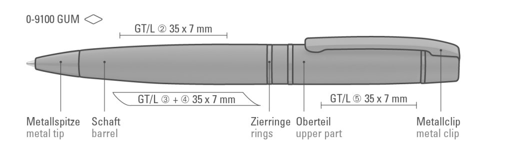 Druckbereich: In Clipverlängerung 35mm x 7mm Lasergravur (L), seitlich vom Clip 35mm x 7mm Lasergravur (L), gegenüber vom Clip 35mm x 7mm Lasergravur (L), auf der Kappe/auf dem Oberteil 35mm x 7mm Lasergravur (L), in Clipverlängerung 35mm x 7mm Tampondruck (GT), gegenüber vom Clip 35mm x 7mm Tampondruck (GT), seitlich vom Clip 35mm x 7mm Tampondruck (GT), auf der Kappe/auf dem Oberteil 35mm x 7mm Tampondruck (GT), in Clipverlängerung 35mm x 7mm Einzelnamensgravur (EL), seitlich vom Clip 35mm x 7mm Einzelnamensgravur (EL), gegenüber vom Clip 35mm x 7mm Einzelnamensgravur (EL), auf der Kappe/auf dem Oberteil 35mm x 7mm Einzelnamensgravur (EL)