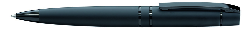 Metall-Drehkugelschreiber mit Softtouch-Gehäuse, Softdrehmechanik und gefedertem Clip. Beschlagteile schwarz glänzend lackiert.