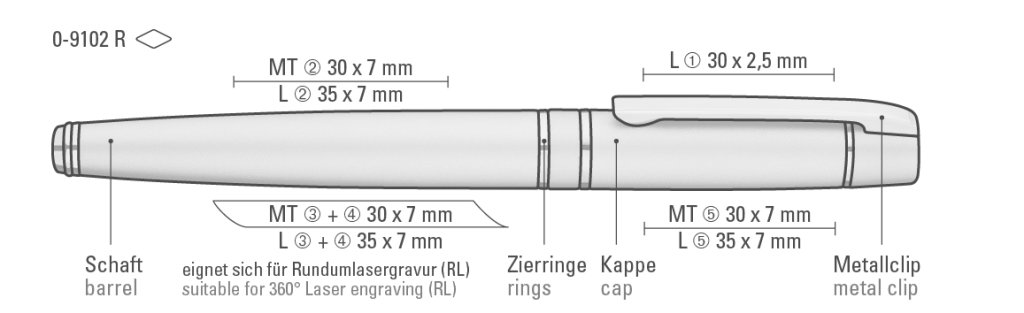 Druckbereich: In Clipverlängerung 35mm x 7mm Lasergravur (L), in Clipverlängerung 30mm x 7mm Tampondruck (MT), gegenüber vom Clip 35mm x 7mm Lasergravur (L), gegenüber vom Clip 30mm x 7mm Tampondruck (MT), seitlich vom Clip 35mm x 7mm Lasergravur (L), seitlich vom Clip 30mm x 7mm Tampondruck (MT), auf der Kappe/auf dem Oberteil 35mm x 7mm Lasergravur (L), auf der Kappe/auf dem Oberteil 30mm x 7mm Tampondruck (MT), auf dem Clip 30mm x 2,5mm Lasergravur (L), Druckfläche 35mm x 41mm Rundumlasergravur (RL), Druckfläche 35mm x 41mm Einzelnamensgravur (EL), in Clipverlängerung 35mm x 7mm Einzelnamensgravur (EL), gegenüber vom Clip 35mm x 7mm Einzelnamensgravur (EL), seitlich vom Clip 35mm x 7mm Einzelnamensgravur (EL), auf der Kappe/auf dem Oberteil 35mm x 7mm Einzelnamensgravur (EL), auf dem Clip 30mm x 2,5mm Einzelnamensgravur (EL)