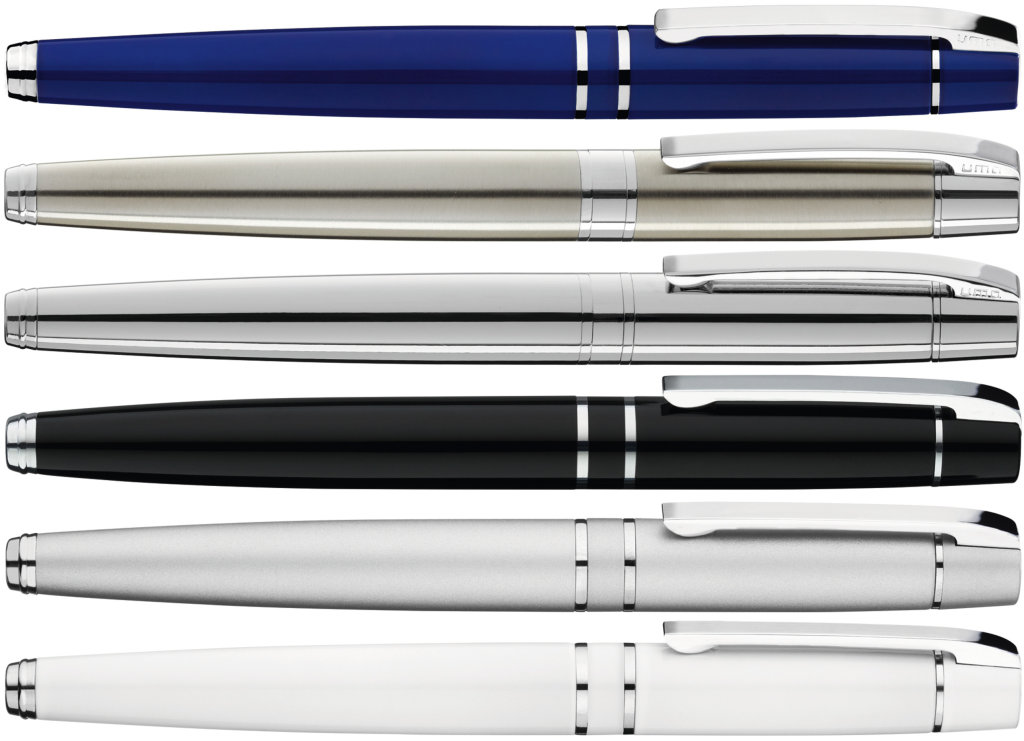 Metall-Rollerball mit gefedertem Clip und schwarzer Gummigriffzone. Beschlagteile glanzverchromt.Druckbereich: In Clipverlängerung 35mm x 7mm Lasergravur (L), in Clipverlängerung 30mm x 7mm Tampondruck (MT), gegenüber vom Clip 35mm x 7mm Lasergravur (L), gegenüber vom Clip 30mm x 7mm Tampondruck (MT), seitlich vom Clip 35mm x 7mm Lasergravur (L), seitlich vom Clip 30mm x 7mm Tampondruck (MT), auf der Kappe/auf dem Oberteil 35mm x 7mm Lasergravur (L), auf der Kappe/auf dem Oberteil 30mm x 7mm Tampondruck (MT), auf dem Clip 30mm x 2,5mm Lasergravur (L), Druckfläche 35mm x 41mm Rundumlasergravur (RL), Druckfläche 35mm x 41mm Einzelnamensgravur (EL), in Clipverlängerung 35mm x 7mm Einzelnamensgravur (EL), gegenüber vom Clip 35mm x 7mm Einzelnamensgravur (EL), seitlich vom Clip 35mm x 7mm Einzelnamensgravur (EL), auf der Kappe/auf dem Oberteil 35mm x 7mm Einzelnamensgravur (EL), auf dem Clip 30mm x 2,5mm Einzelnamensgravur (EL)Minenfarbe: SchwarzOberfläche: MetallGewicht: 47,42 gMaterial: Metall