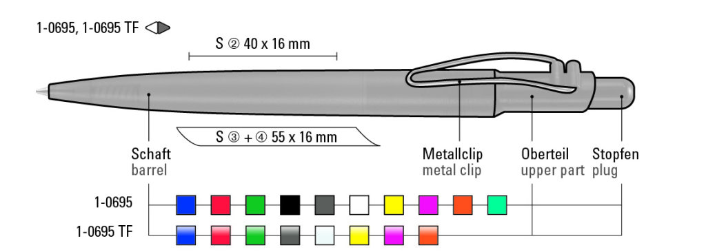 Druckbereich: In Clipverlängerung 40mm x 16mm Siebdruck (S), gegenüber vom Clip 55mm x 16mm Siebdruck (S), seitlich vom Clip 55mm x 16mm Siebdruck (S)