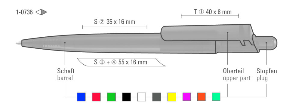 Druckbereich: In Clipverlängerung 35mm x 16mm Siebdruck (S), auf dem Clip 40mm x 8mm Tampondruck (T), seitlich vom Clip 55mm x 16mm Siebdruck (S), gegenüber vom Clip 55mm x 16mm Siebdruck (S)