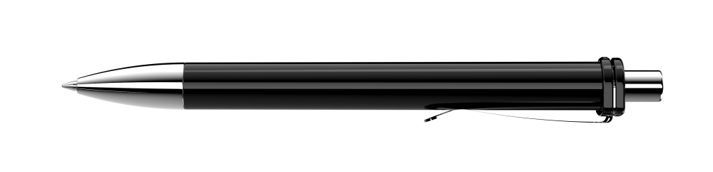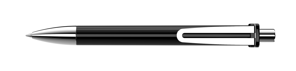 Druckkugelschreiber mit gedeckt glänzendem Schaft und Clipaufhängung. Breiter Metallbiegeclip, Metallspitze und Metalldrücker glanzverchromt.Druckbereich: In Clipverlängerung 40mm x 20mm Siebdruck (S), seitlich vom Clip 80mm x 13mm Siebdruck (S), gegenüber vom Clip 80mm x 13mm Siebdruck (S)