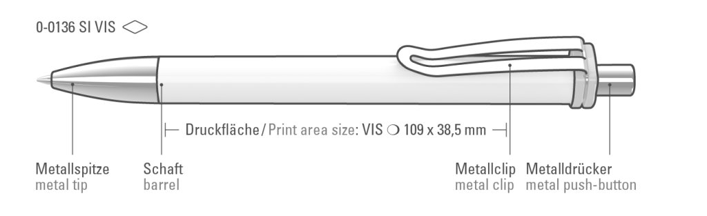 Weißer Kunststoff-Kugelschreiber mit farbigem Clip, blauschreibend.Maße: ø10×138 mmSchreibgerät-Typ: KugelschreiberSchreibgerät-Mechanik: DruckmechanikSchreibfarbe: BlauMinentyp: Normale MineLinienstärke: 1 mmMaterial: Kunststoff (ABS)Veredelungsposition 1: Korpus - rechts vom ClipTechnologie: UV-LED-Druck - EinzelnamenDurchmesser: 0Druckcode: NUVATechnologie: TampondruckMaximale Farben: 4Durchmesser: 0Druckcode: P0Technologie: TampondruckMaximale Farben: 1Durchmesser: 0Druckcode: P1Technologie: UV LED DruckDurchmesser: 0Druckcode: UVAVeredelungsposition 2: Korpus - links vom ClipTechnologie: UV-LED-Druck - EinzelnamenDurchmesser: 0Druckcode: NUVATechnologie: TampondruckMaximale Farben: 4Durchmesser: 0Druckcode: P0Technologie: TampondruckMaximale Farben: 1Durchmesser: 0Druckcode: P1Technologie: UV LED DruckDurchmesser: 0Druckcode: UVAVeredelungsposition 3: KlipTechnologie: TampondruckMaximale Farben: 4Durchmesser: 0Druckcode: P0Veredelungsposition 4: Korpus - in Verlängerung vom ClipTechnologie: TampondruckMaximale Farben: 4Durchmesser: 0Druckcode: P0
