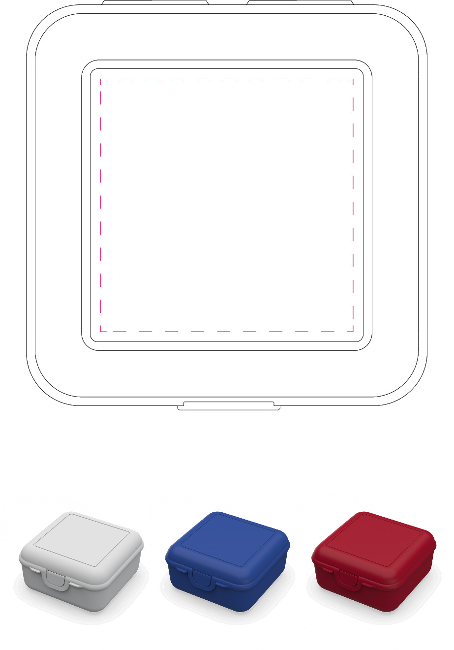 Die ideale Box für das Pausenbrot – mit Klickverschluss sicher verschließbar. In vielen Farben erhältlich und optimal für die Veredelung per IMould-Verfahren geeignet.Material: KunststoffMaße: 125 x 85 x 40 x Ø: 0,00 mmGewicht: 65 gDruckmöglichkeitenPosition 1: Oben mittigDruckart: SiebdruckDruckgruppe: DBMaximale Farben: 5Breite: 100 mmHöhe: 57 mmPosition 2: Unten mittigDruckart: SiebdruckDruckgruppe: DBMaximale Farben: 5Breite: 70 mmHöhe: 60 mm