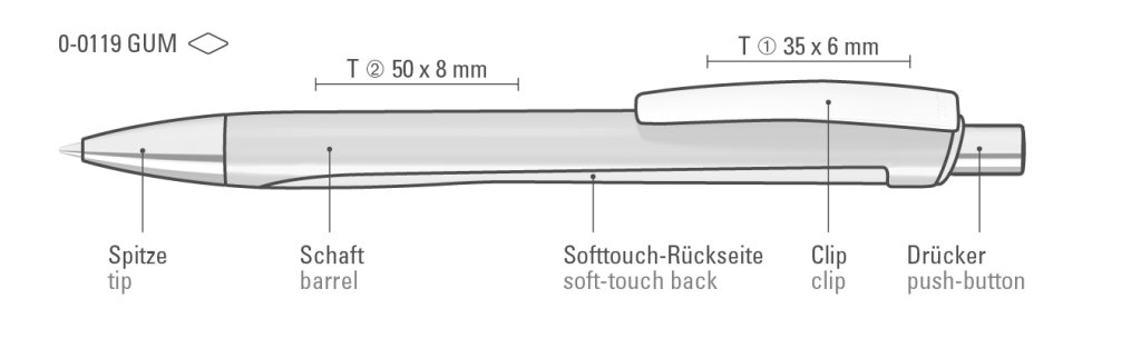 Druckbereich: Auf dem Clip 35mm x 6mm Tampondruck (T), in Clipverlängerung 50mm x 8mm Siebdruck (S)